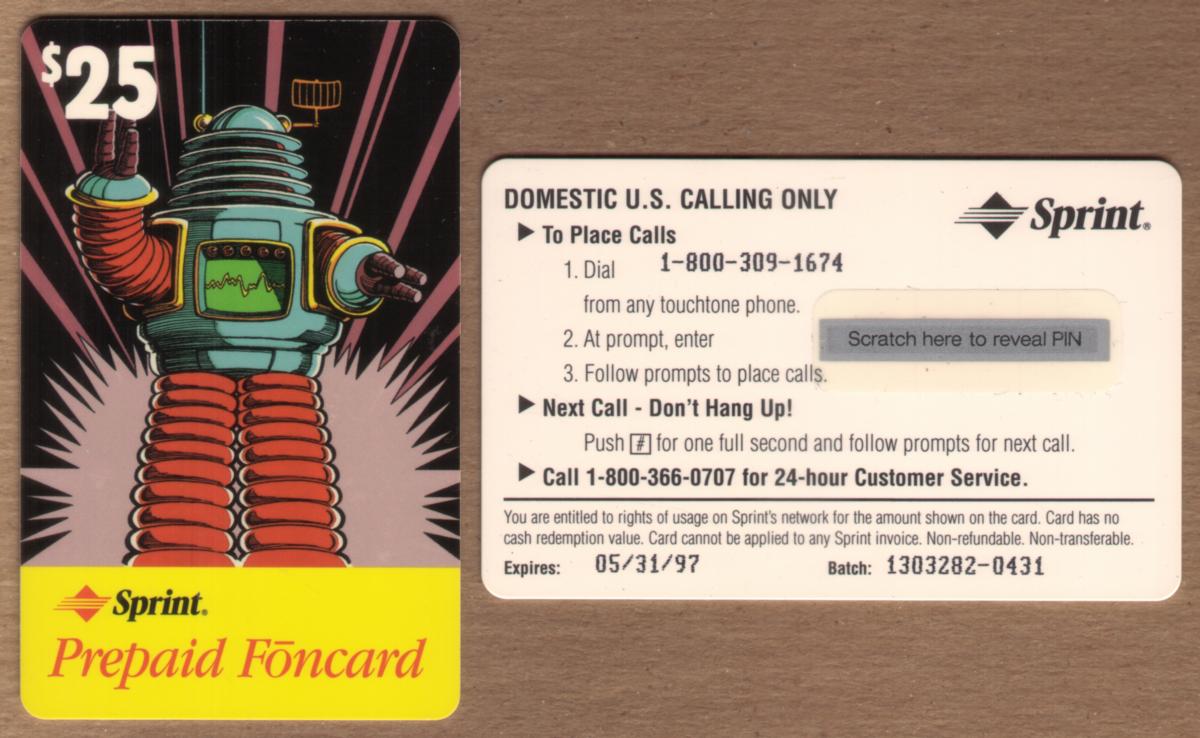 The front of the card includes the text "$25" indicating its value, along with the words "Robot Prepaid Foncard" and "Sprint," making it clear this is a prepaid phone card issued by Sprint. The Sprint logo is visible in the upper right corner, printed in its distinctive italicized blue font. The overall design enhances the theme of advanced robotics and communication technology.
