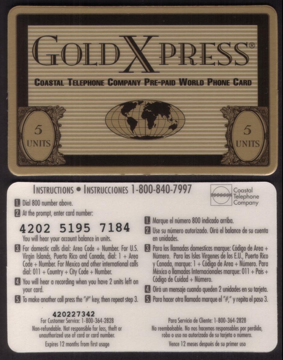 This phone card is connected to Global Express and Coastal Telephone Company, as indicated by the text on the card. It provides five units of phone service, which aligns with the “5u” printed on the card. The card is intended for international or wide-area telephone use, suggested by the world map motif and the “World Phone Card” designation.