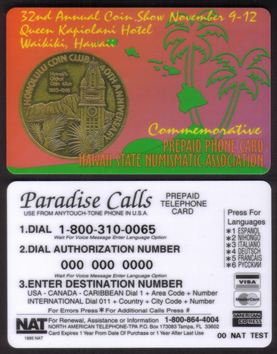 The card was issued in connection with the Kapiolani 5M 32nd Annual Coin Show held in November 1995 under the Hawaii State Numismatic Association. The front of the card includes the logo and name of the Honolulu Coin Club, reinforcing the event’s connection to the local numismatic community. The text “WorldCom” also appears, likely referencing the telecommunications service provider linked to this phone card.