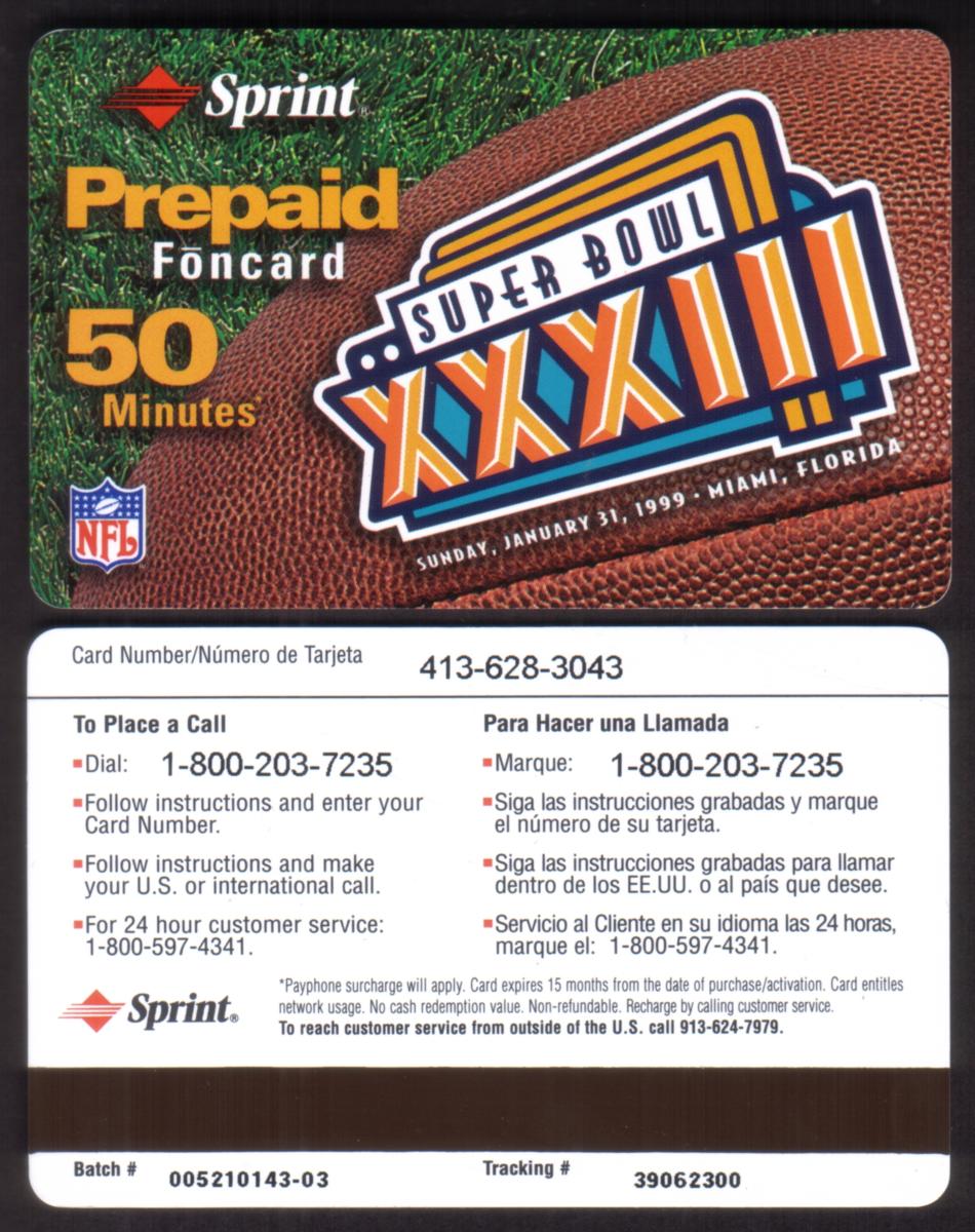 This collectible prepaid phone card commemorates Super Bowl XXXIII, held in January 1999 in Miami, Florida. The card features vibrant imagery associated with the National Football League (NFL) and football players. Central to the design is an action shot of NFL players on the field wearing their uniforms, engaged in a football play. The players’ jerseys display clear team colors and logos relevant to the NFL, emphasizing the professional football event.