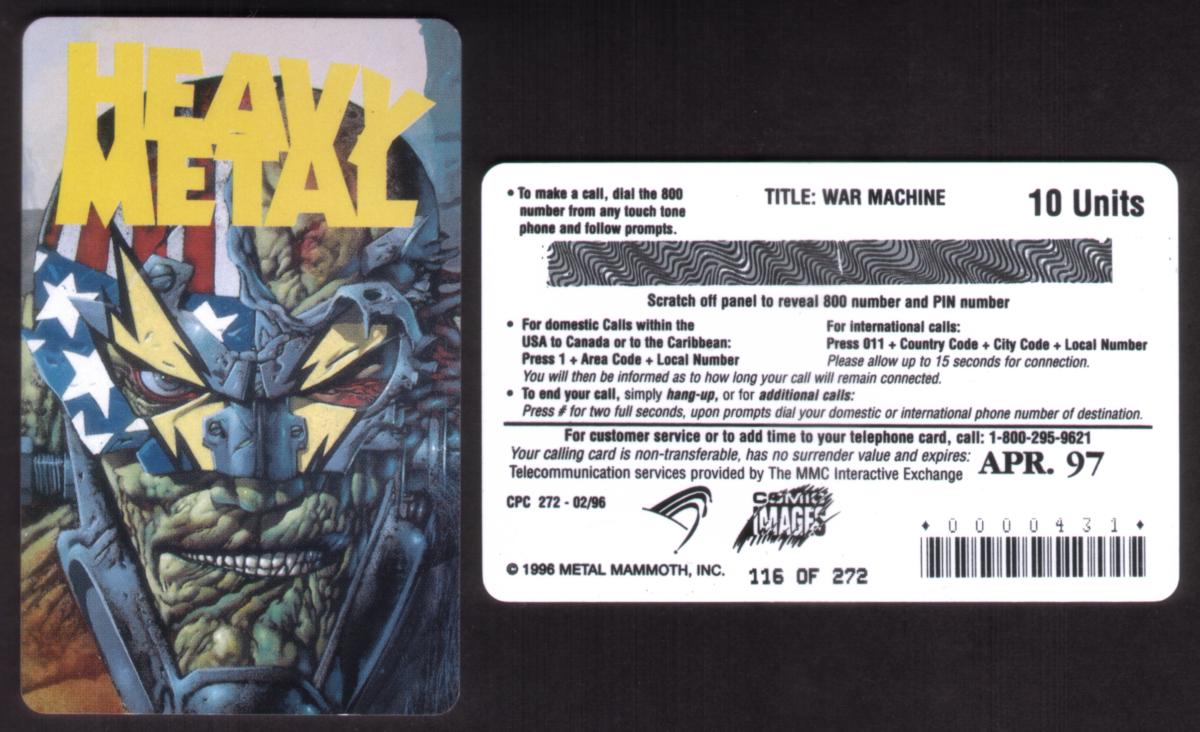 The card is branded by Mercury Marketing, which is clearly indicated on the front. The words "Heavy Metal War Machine" and "Metal Mammoth Comic Images" are prominently displayed, connecting the visual art directly to the comic series. The card presents an artistic style that balances realism with comic book exaggeration, making it a notable piece for collectors interested in comic-themed phone cards or heavy machinery rendered in graphic art form.