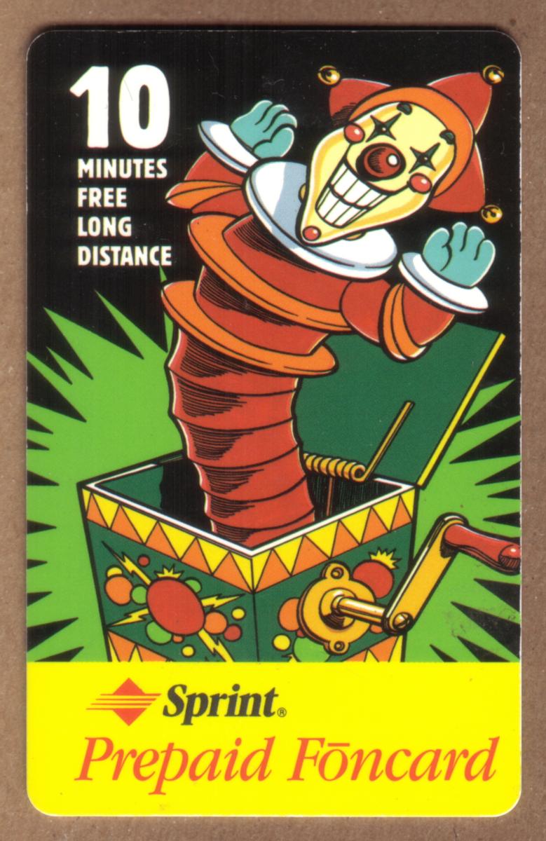 The overall design is vibrant with a playful theme centered around the jack-in-the-box character, combining bright colors like green, red, yellow, and blue. The card is a Sprint Prepaid Foncard with a $25 user value.