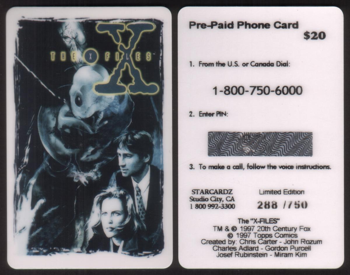 The card’s design includes the official X-Files logo along with graphic elements consistent with the series' dark and mysterious aesthetic. It is intended as a collectible item, reflecting the popular culture impact of The X-Files franchise during the 1990s. The card is part of the Starcardz collectible series and highlights the collaboration between the creators and artists mentioned.
