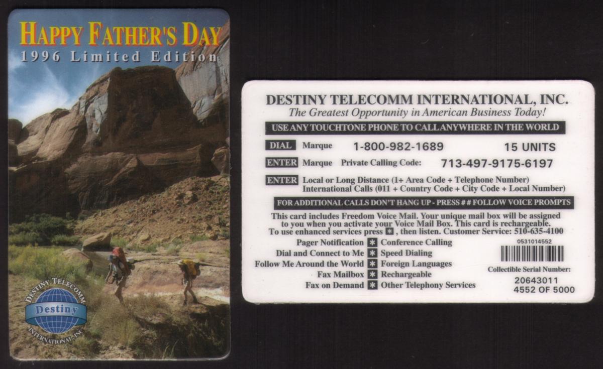The card includes text indicating its association with Father’s Day, marked as “15u Father’s Day Father & Child Hiking In The Mountains.” The brand name Destiny Telecomm appears in the upper right corner against a blue sky backdrop. The card’s layout places the numerical value “15u” near the bottom, denoting the card’s unit value for telephone use.