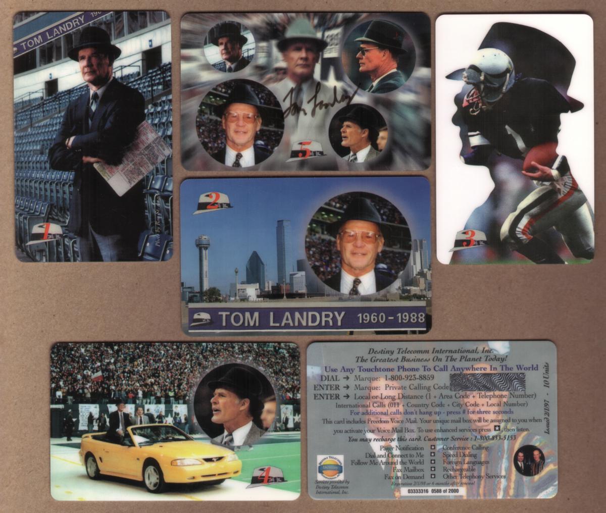 The set is identified as a Destiny Telecomm release, indicated by its branding. It is presented as a cohesive group of five cards, each signed by Tom Landry and celebrating key elements of football culture and history through compelling visual presentation and authentic memorabilia.