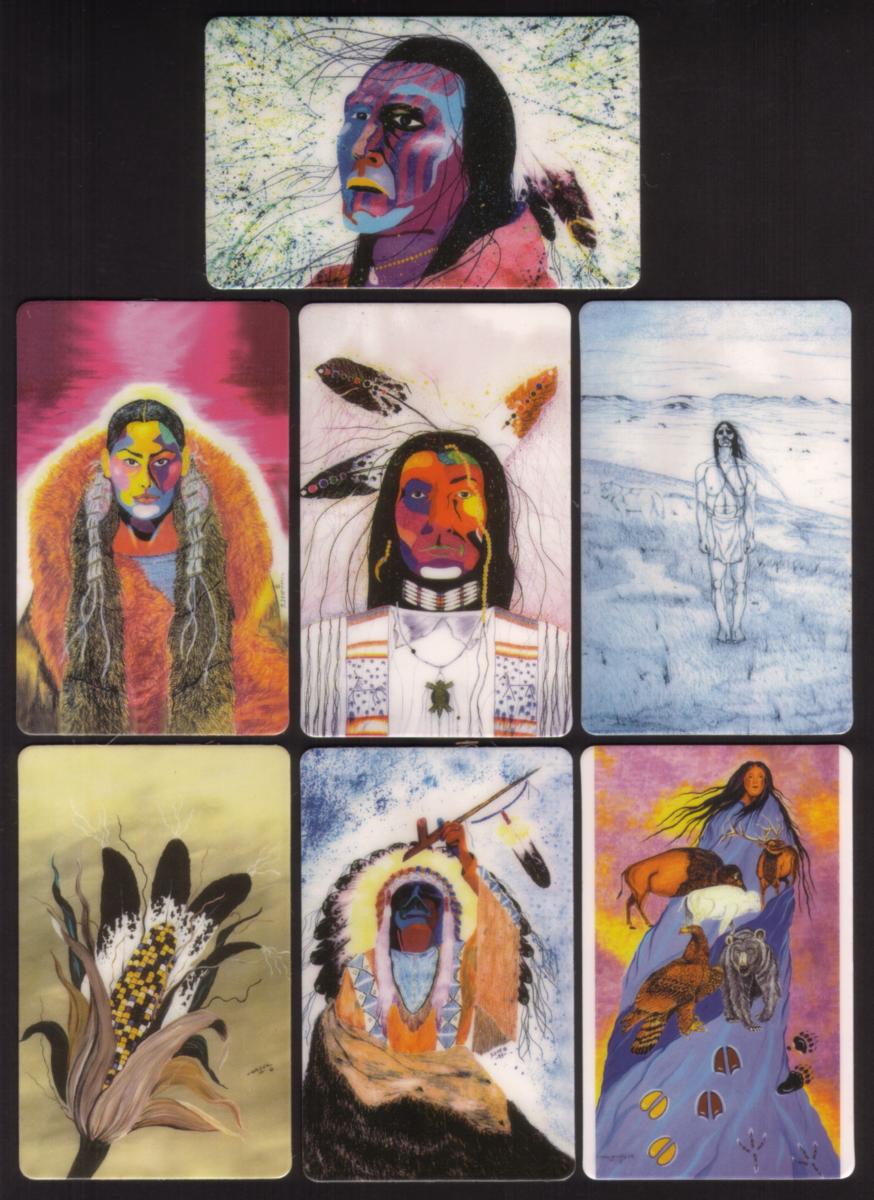 Discover a set of seven Native American-themed cards by Standing Elk, showcasing vibrant artwork of figures, animals, and spiritual symbols. |