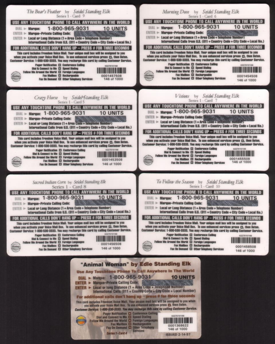 This phone card is part of a series consisting of seven different designs, though this specific card is noted as an incomplete set. It serves as a collectible item that honors Native American artistry and Cheyenne cultural significance, presented with bold, clear lettering and rich visual elements associated with the named figures and themes.