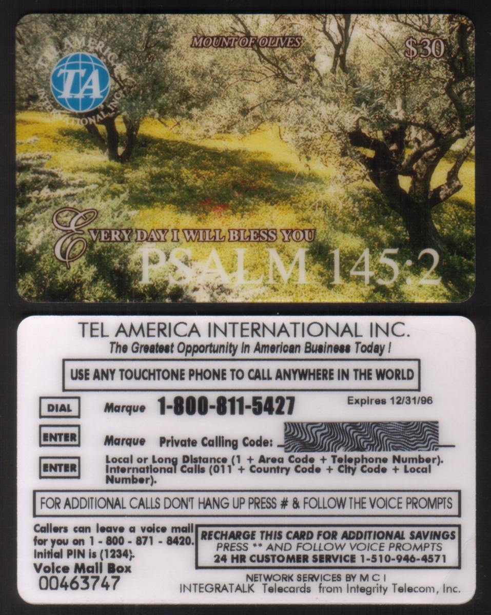 The card is issued by TelAmerica and is branded with the Destiny Telecomm and Integrity Telecom logos. These details link the card to telecommunications providers known for collectible phone cards with faith-based messaging. The text "TelAmerica $30" indicates the card’s monetary value for usage as a phone card. The design incorporates clear typography with phrases emphasizing blessings and religion, reinforcing the spiritual theme.