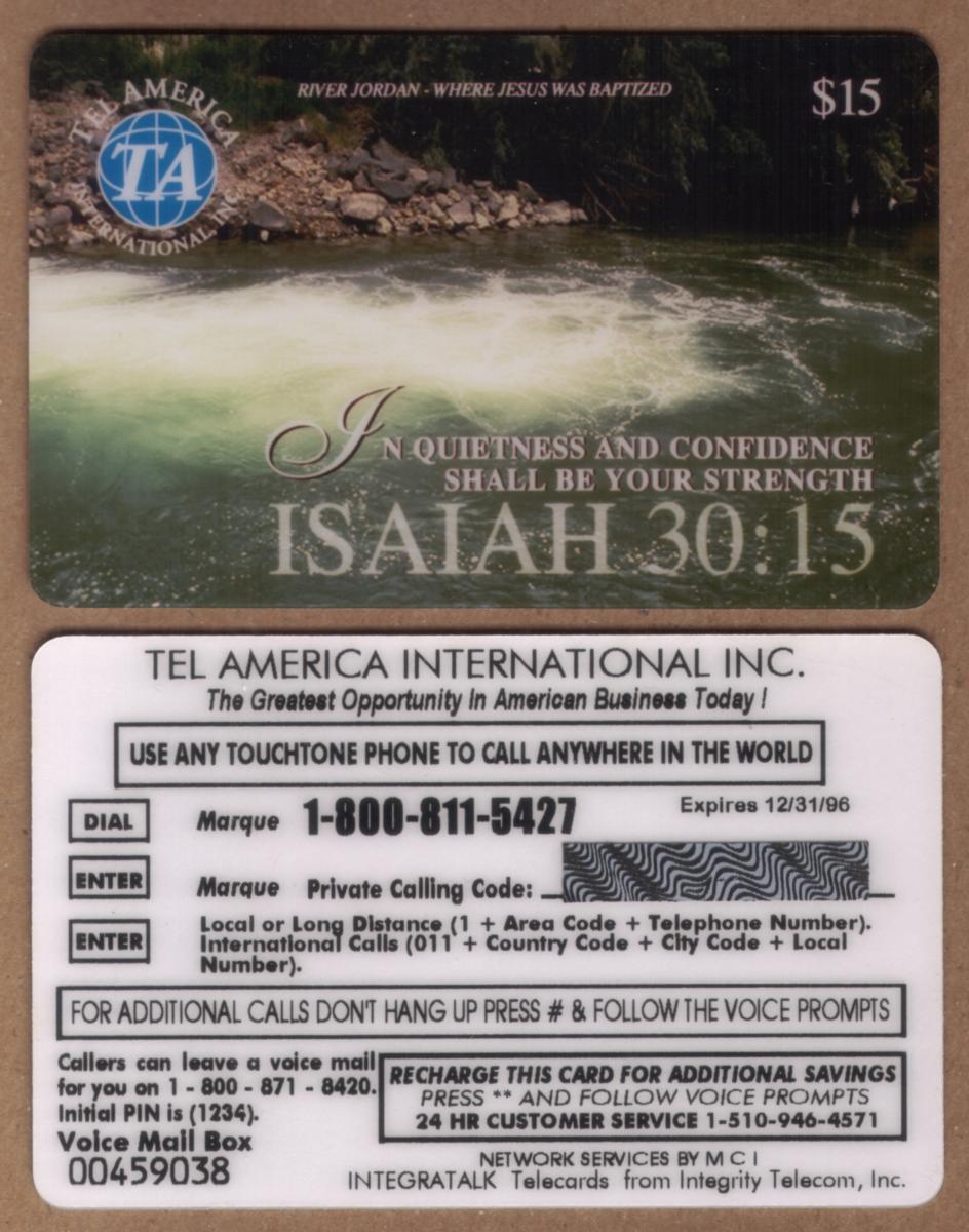 The card includes branding from TelAmerica and Destiny Telecomm, with TelAmerica also referenced as "Integrity Telecom." The design includes the TelAmerica $15 value displayed on the card, indicating its denomination for telephone use. The words "Bible," "Jesus," "Religion," "Christian," and "Christianity" are evident through text and the imagery shown, reinforcing the card’s religious significance.
