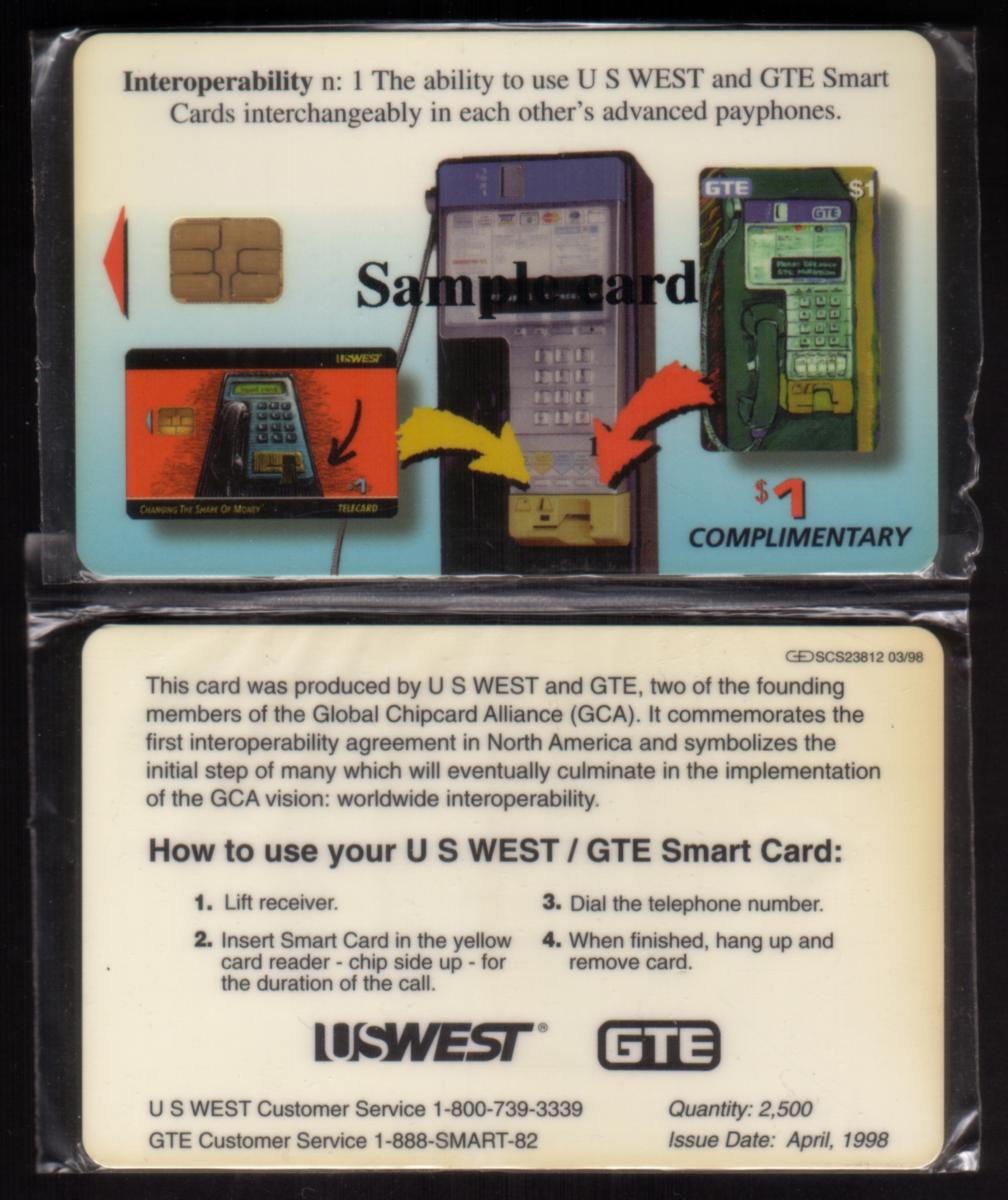 This card is a functional collectible item from the era when chip phone cards were widely used for accessing public pay phones, especially in the U.S. It serves as an example of provider cooperation between U.S. West and GTE, reflecting telecommunications industry developments during that period. The clean, straightforward design and labeling make it a notable piece for collectors of telephone-related memorabilia and smart card technology.