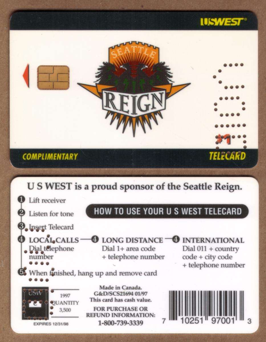 Overall, the card highlights its connection to basketball, telecommunications, and stored value technology through distinct logos and text. It serves both as a collectible item for fans of the Seattle Reign women’s pro basketball team and as an example of a U.S. West Communications chip card designed for stored value service.