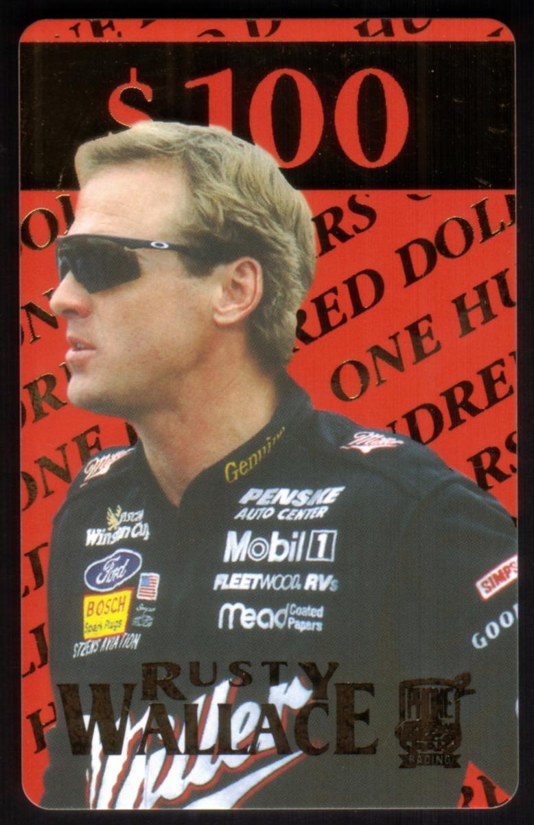 This collectible phone card features Rusty Wallace, a prominent NASCAR driver, associated with the Miller Beer racing team. The card highlights auto racing, specifically NASCAR, with images of race cars prominently displayed. The card includes branding related to automotive and racing companies such as Ford, Penske, Bosch, and Mobile Oil, connecting it to the Winston Cup series. The design merges themes of speed, automotive engineering, and racing sponsorship.