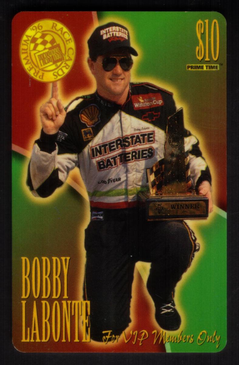 The card is identified as a "$10 Prime Time" collectible from the 1996 premium race cards series. It is part of the VIP Press Pass Racing collection and marked specifically for VIP Members Only, indicating exclusivity. The design incorporates a gradient background ranging from red on the left to green on the right, with yellow text at the bottom reading "BOBBY LABONTE" in large capital letters and “For VIP Members Only” in cursive below.