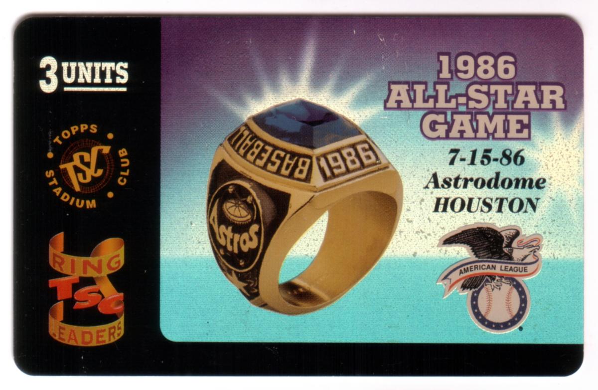 This collectible card features a detailed image related to the 1986 Major League Baseball All-Star Game held at the Astrodome in Houston, Texas. The front of the card displays the American League logo prominently alongside the official emblem of the 1986 All-Star Game. The top center includes the text "TSC Ring Leaders," indicating it is part of the Topps Stadium Club Ring Leaders series. The card highlights the American League of Professional Baseball Clubs, emphasizing its connection to major league baseball players.