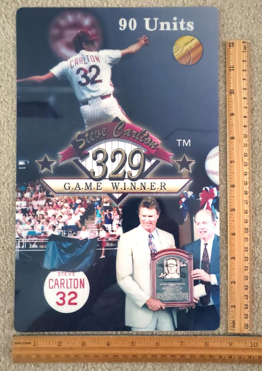 This collectible baseball-themed card features legendary MLB pitcher Steve Carlton, highlighted as a "329 Game Winner." The card measures about 13 1/2 inches by 8 1/2 inches and contains 90 units. The focal point is a dynamic image of Steve Carlton wearing a white pinstriped uniform with the number 32 on his back, caught mid-pitching motion from behind. The name "Steve Carlton" is prominently displayed in a stylized banner across the center of the card above the large "329" numerals, underscoring his career achievement.