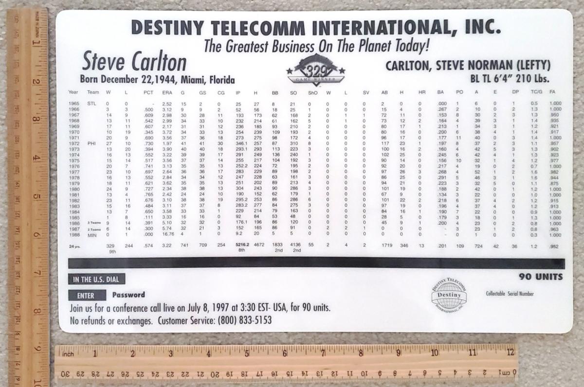 The card’s design combines action photography, commemorative elements, and player memorabilia to celebrate Steve Carlton’s accomplishments in Major League Baseball. Printed text and imagery convey the card’s tribute to Carlton’s career without additional clutter, and the card shows some signs of wear such as scratches and smudges, consistent with a used collectible. This item is linked to Destiny Telecom and highlights one of the all-time great pitchers with factual career reference.