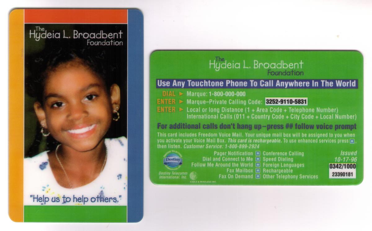 Overall, this phone card serves as a fundraising and promotional tool for The Hydeia L Broadbent Foundation and its mission. It combines the reach of telecommunication services with the message of combating HIV/AIDS, representing collaboration between community activists, nonprofit organizations, and corporate partners such as Destiny Telecomm and Cable & Wireless.