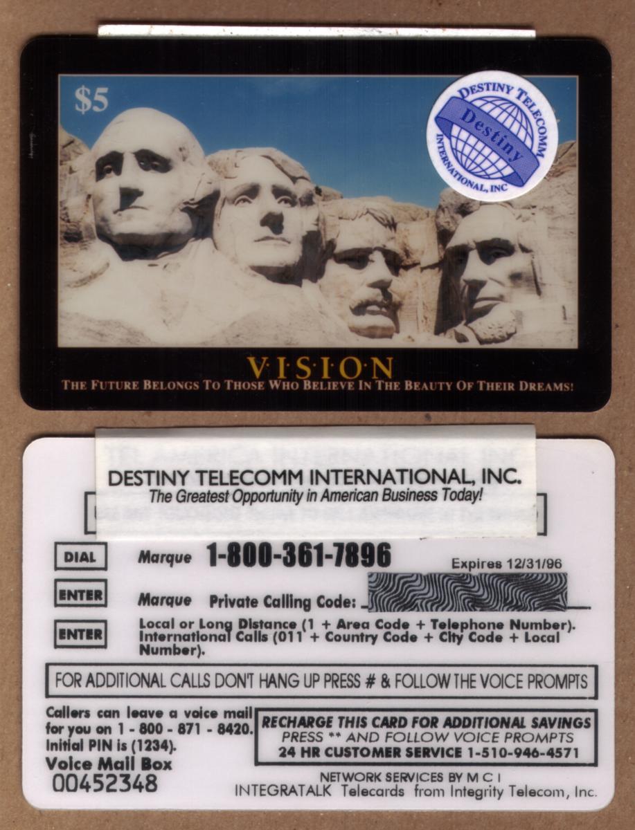 The card includes the text “Tel America Vision Mount Rushmore” and “Destiny Telecomm” along with the denomination “$5” prominently displayed. Additionally, the phrase “The future belongs to those who believe in the beauty of their dreams” appears on the card, aligning it with a motivational series theme. The branding “Tel America” and the word “Destiny” are also clearly visible, connecting the card to its issuing telecommunication company. The card features official-looking stickers related to corporate transition, indicating a period of change for the issuing entity.