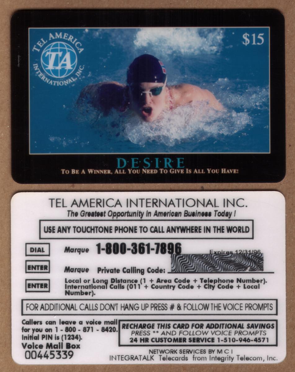 This collectible phone card features a photographic image of a swimmer in action. The swimmer is captured mid-stroke with water splashing around, emphasizing the motion and intensity of the sport. The background includes a swimming pool with lane markings. The card includes prominent logos for TelAmerica, Destiny Telecomm, and IntegraTalk, indicating the telecommunications providers associated with the card.