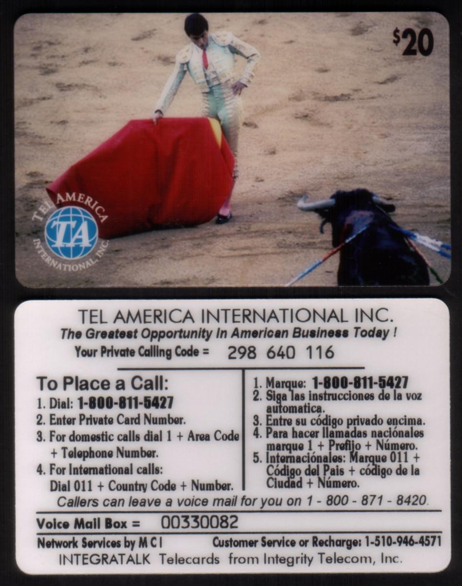 The background contains muted colors that keep focus on the bullfighter and bull, with subtle shading to enhance the depth of the scene. The card's design integrates the theme of animal rodeo events with telecommunications branding, linking rodeo imagery and cultural references to the service represented by the card. This collectible phone card combines the sport of bullfighting with corporate identity from Tel America and IntegraTalk, highlighting both the cultural and commercial elements.