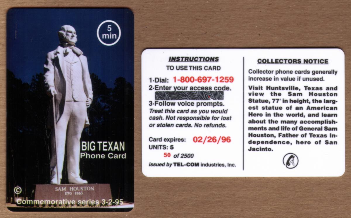 The phone card emphasizes the importance of General Sam Houston in Texas and American history, presenting him as a patriotic figure. The card's layout balances the striking visual of the statue with clear text, making it both a collectible item and a tribute to American heritage.