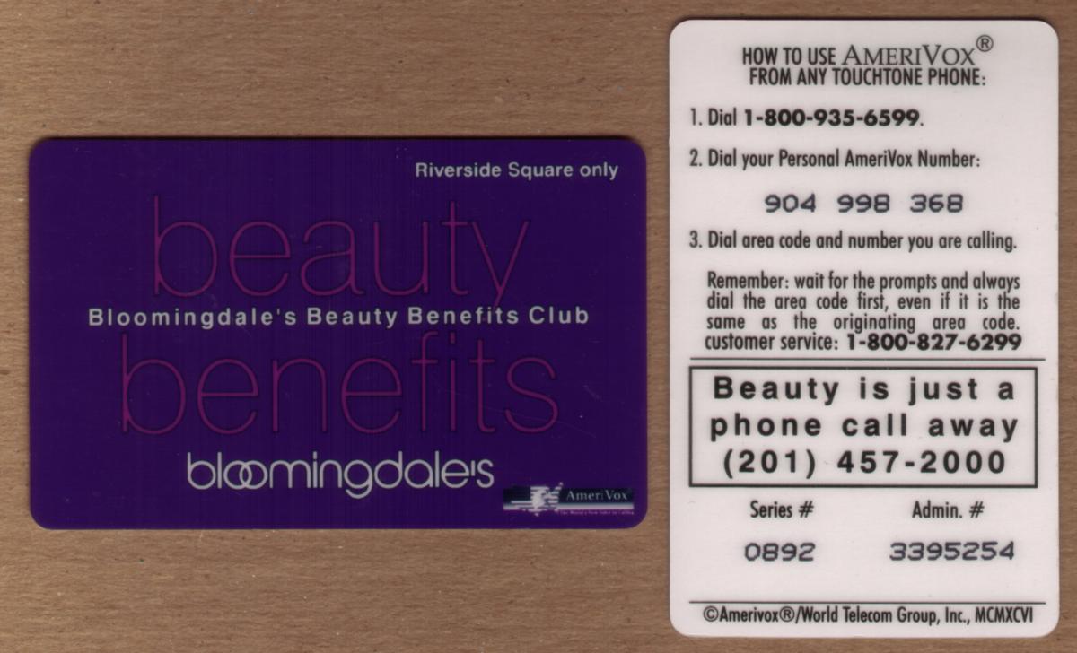 Overall, this phone card serves as a collectible item linked to Bloomingdale’s Beauty Benefits Club promotion, representing a regional private labeling from AmeriVox aimed at customers in the Hackensack, New Jersey area.