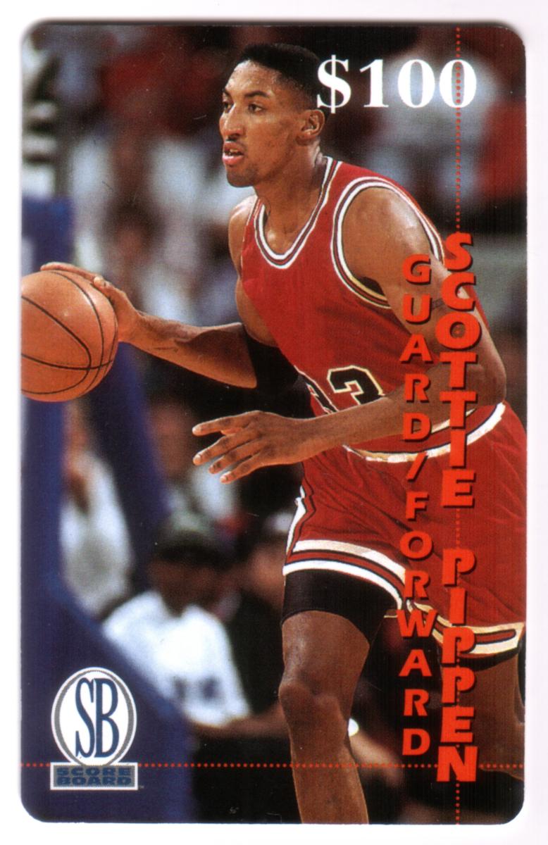 On the right side of the card, bold red vertical text reads "SCOTTIE PIPPEN" and "GUARD/FORWARD." The top right corner shows the denomination "$100" in white font. The bottom left corner contains the logo "SB" with the words "SCORE BOARD," indicating the issuing brand.