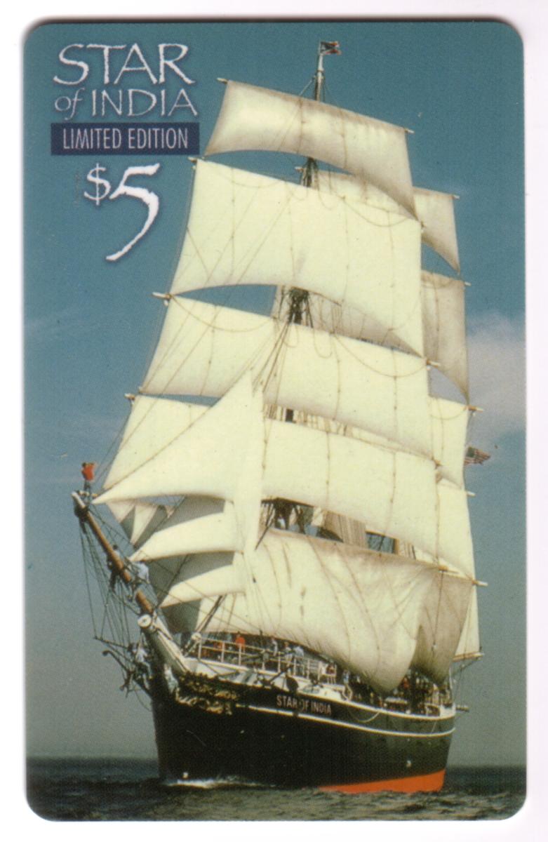 The card denotes a $5 value and is marked as a "Limited Edition." The Star of India is well-known as a historic vessel preserved by the Maritime Museum Association of San Diego. It is recognized as a California Historical Landmark and a National Historic Landmark. The iconic ship represents maritime history and travel, highlighting its significance as one of the world’s oldest active sailing ships.