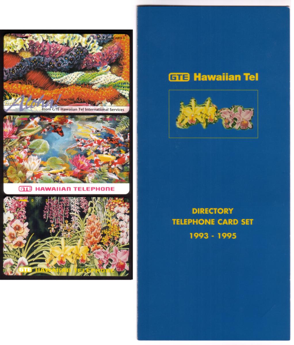 This collectible phone card set features three cards housed in a folder labeled "Leis, Koi & Orchids 1993-95" and was issued by GTE Hawaiian Telephone. Each card showcases striking artistic imagery centered around Hawaiian themes. The first card presents a vibrant depiction of tropical flowers and floral arrangements, capturing the lush plant life native to Hawaii. The colors are vivid, emphasizing the natural beauty and diversity of Hawaiian flora.