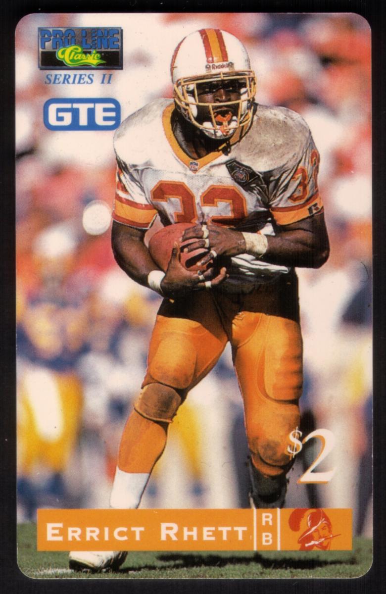 This collectible phone card features football player Errict Rhett in full uniform on the front. Rhett is wearing a white helmet with a red and yellow stripe down the center and a white jersey with the number 32 in red outlined in yellow. He holds a football securely in both hands, appearing to run in an action shot on the field. His pants are yellow with some visible scuffs and pads, and he wears a white wristband on his right wrist.