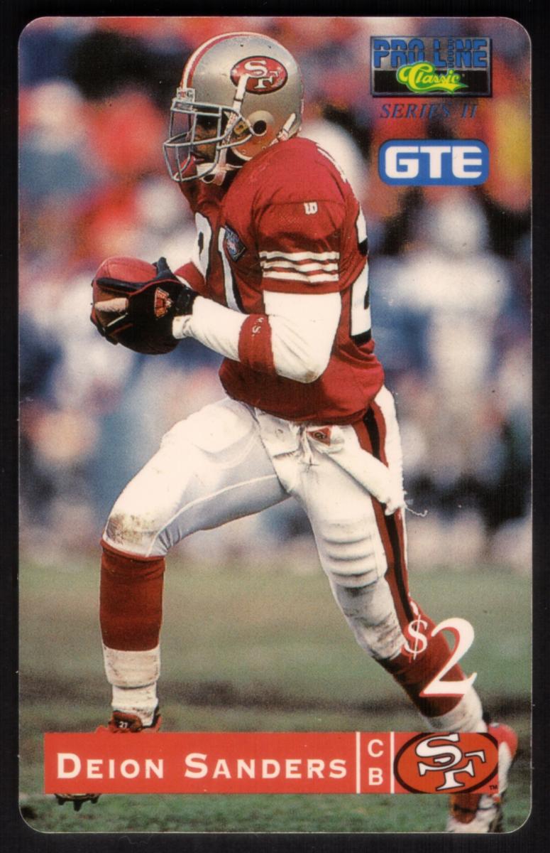 The design includes several logos and text elements. The upper right corner displays the "Proline Classic Series III" logo in green and yellow above a blue "GTE" logo. At the bottom right corner, the card has a "$2" denomination in white text with red outlining. Directly below the image is a red bar containing "DEION SANDERS" in bold white letters followed by the position abbreviation "CB" (cornerback) and the San Francisco 49ers team logo in a circle.