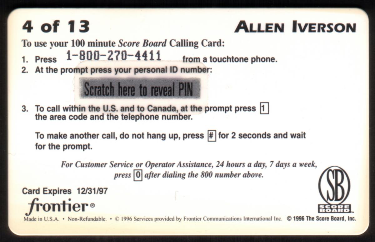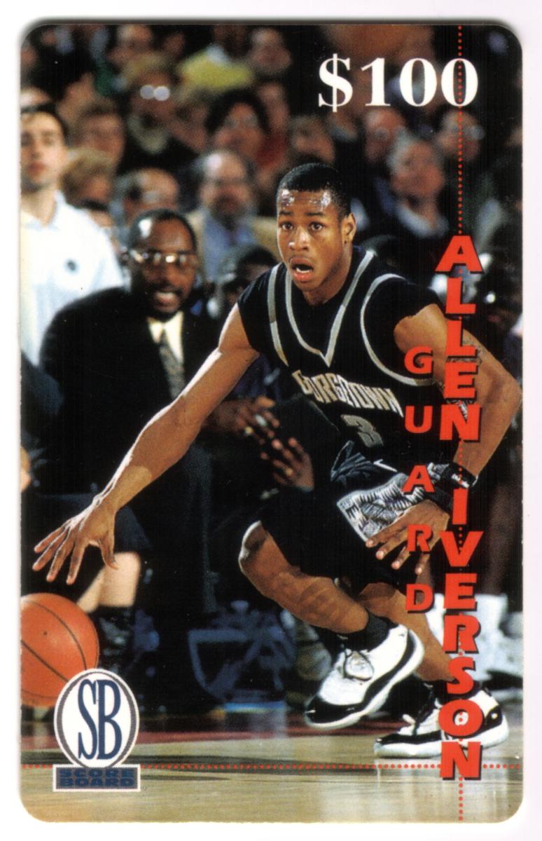 This card is associated with the National Basketball Association (NBA) and highlights one of basketball’s well-known guards, Allen Iverson, during his college basketball career at Georgetown University. It is card number 4 out of 13 in the series titled "The Score Board," with an expiration date of 12/31/97.
