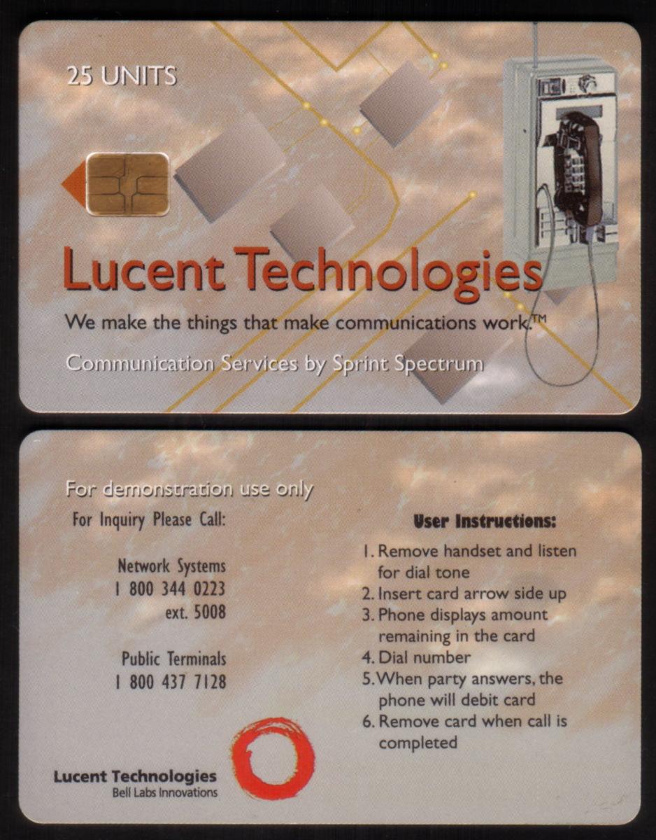 The card’s purpose is indicated clearly by the inclusion of "demonstration use" and "phones on phone cards" keywords, highlighting its role as a stored value chip card designed for telecommunications purposes within the Sprint Spectrum network. Bell Labs Innovations and Lucent Technologies are the principal entities referenced, linking the card to advanced telecom development and innovation.