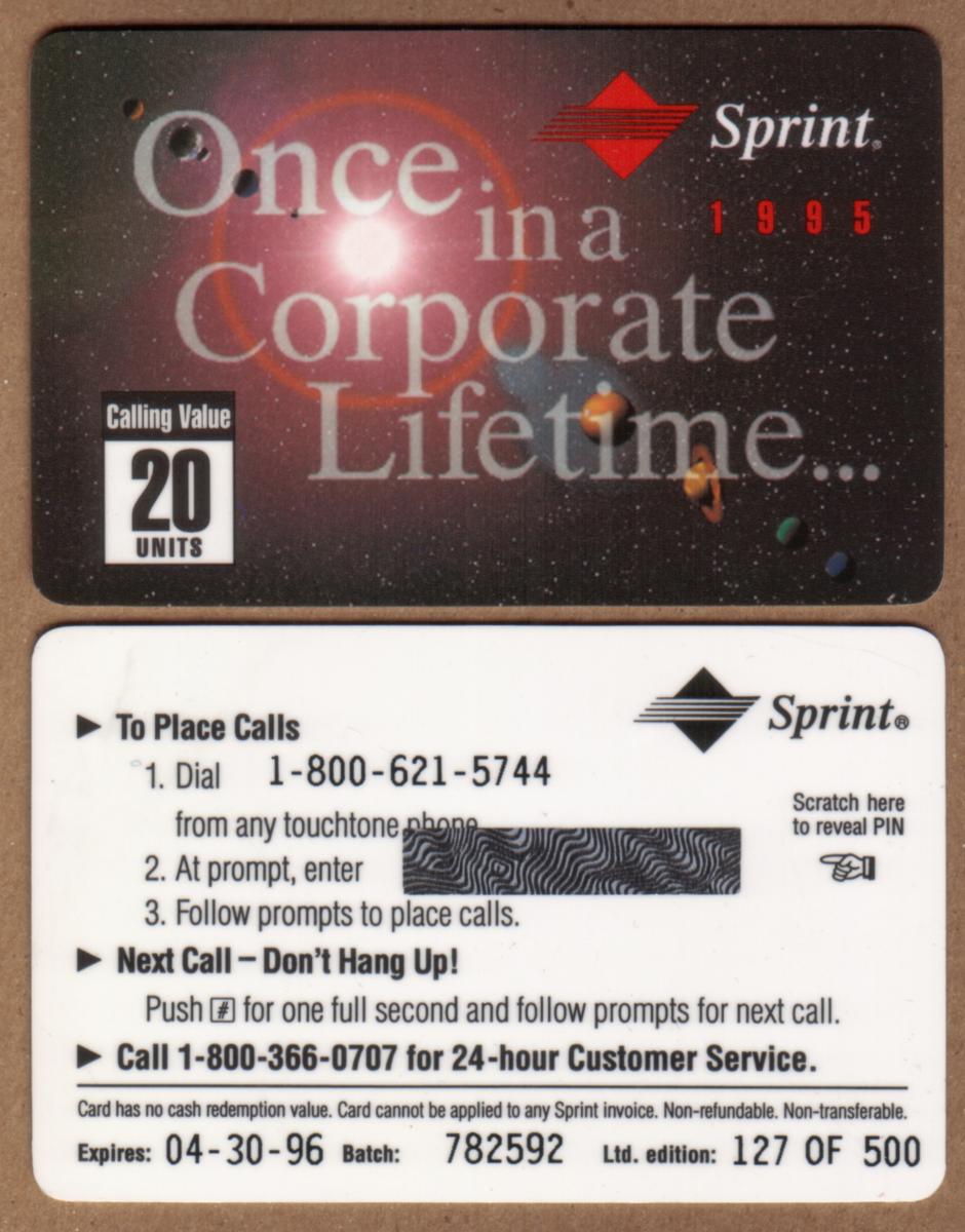 This phone card commemorates a high-profile corporate promotion tied to world-class telecommunications companies. It embodies the space theme through its vivid planetary imagery and corporate branding, emphasizing Sprint's position in the market alongside AT&T and MCI. The use of specific numeric and textual details ensures this card serves as a valuable collectible item representing a significant moment in telecommunications history.