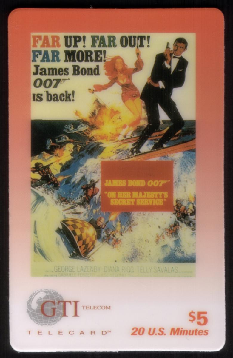 This collectible phone card features imagery related to the James Bond 007 film "On Her Majesty's Secret Service." The design prominently showcases the $5 denomination and includes the name George Lazenby, who starred as James Bond in this movie. The card references Ian Fleming, the author behind the James Bond spy series, emphasizing its connection to the iconic spy and espionage genre. The card was issued by GTI Telecom, Inc.
