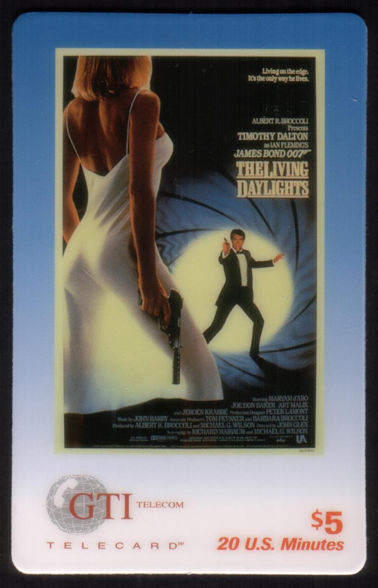 The title "The Living Daylights" appears clearly on the card, along with the classic "007" logo featuring the iconic gun barrel design associated with the James Bond franchise. The card also bears the GTI Telecom, Inc. logo, linking it to its issuing telecommunications company. The denomination "$5" is visible, indicating the prepaid value of the phone card.