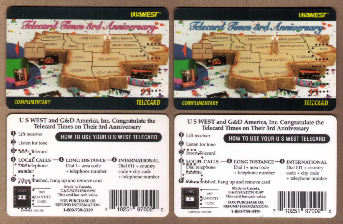 This set reflects collectible telecommunication memorabilia from the U.S. West company during the period when stored value telephone cards were widely used. The combination of the U.S. West branding, Telecard Times anniversary reference, and the distinctive red and blue color themes make this a clear example of promotional chip card memorabilia.
