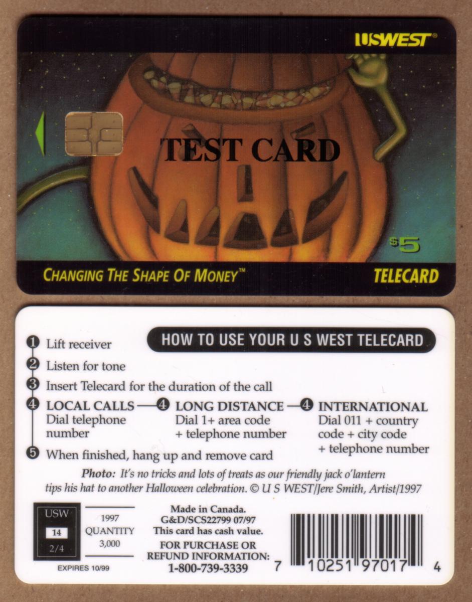 This Halloween-themed stored memory chip card is a sample test card, identified as a collectible item connected to the 1997 holiday season. It is an official U.S. West smart card designed for stored value usage, combining functional technology with artistic holiday artwork. The card’s imagery and text underscore its role as a holiday-themed collectible issued during the late 1990s.