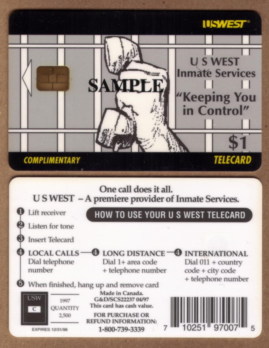 The overall design emphasizes correctional and telecommunications themes, directly referencing inmate services and control within a prison setting. This is a promotional phone card issued by U.S. West Communications, intended as a complimentary sample with a $1 stored value.