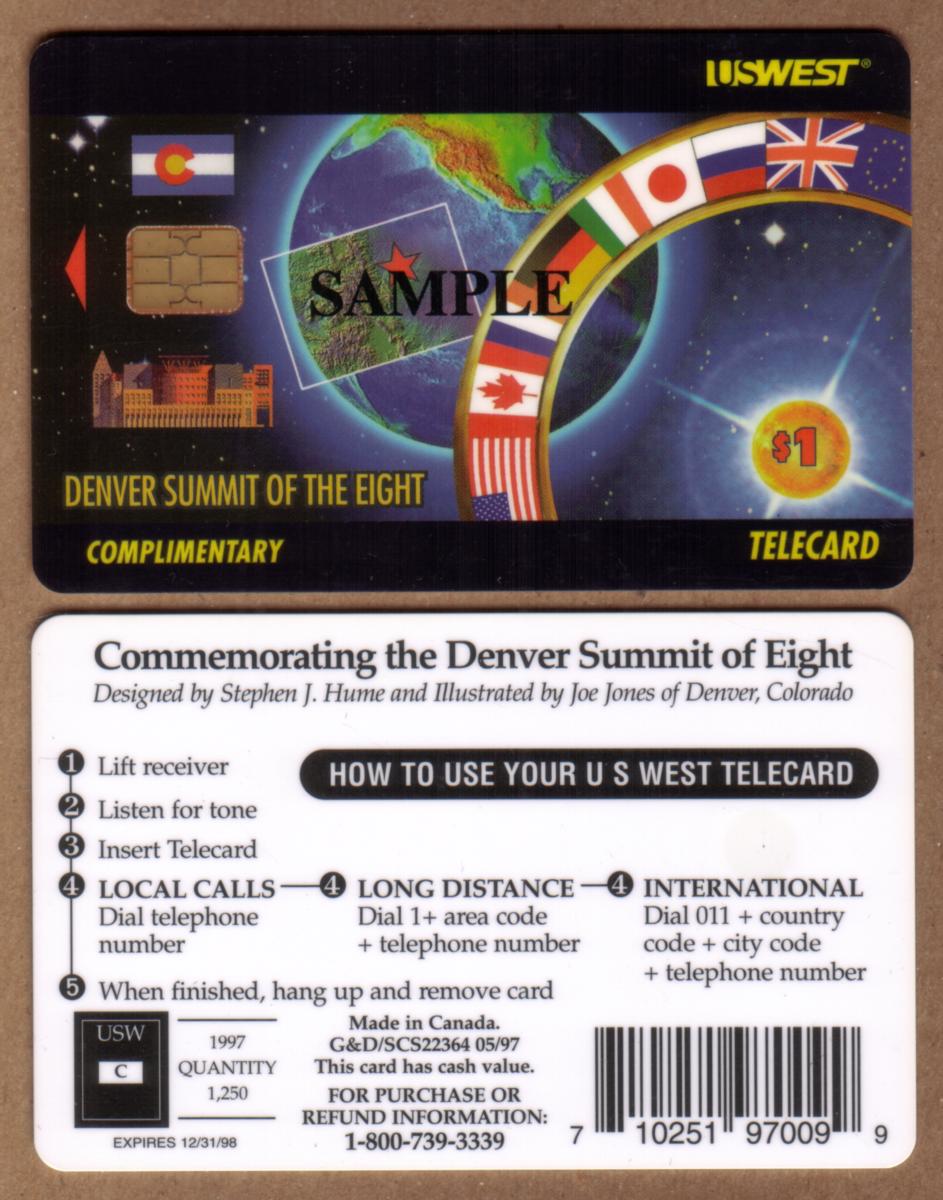 Overall, the card serves as a unique collectible related to an important international economic meeting, combining official event information with national symbols of the G-8 member countries, and is issued by U.S. West Communications with an imprint value of $1.
