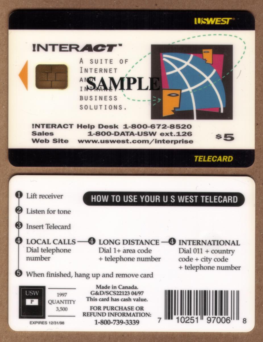 All printing on the card is directly applied; there are no stickers or removable labels. The text includes references to "internet" and "interprise," highlighting its promotional purpose linked to network technology and business communications. The colors used in the card’s design combine blue and yellow tones, contributing to a professional and corporate appearance representative of U.S. West Communications’ branding.