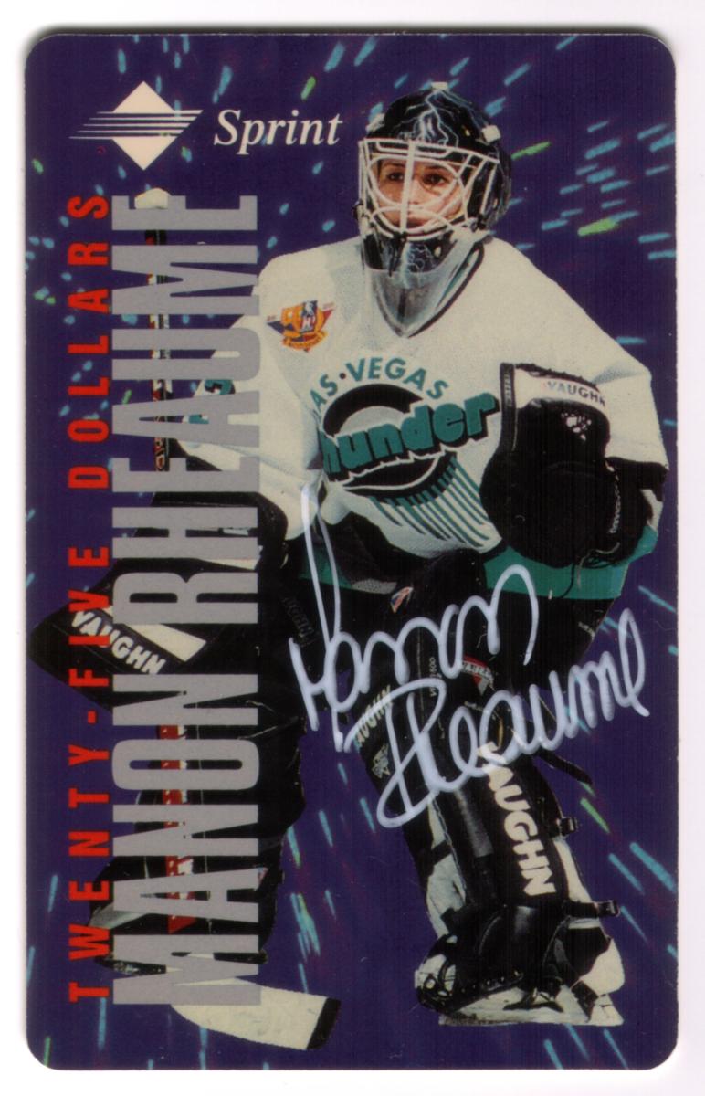 This collectible hockey phone card features Manon Rheaume, a goaltender for the Las Vegas Thunder, a professional ice hockey team. She is pictured wearing the team’s white jersey with the Las Vegas Thunder logo prominently displayed on the chest. The uniform includes black pants and black goalie pads branded "Vaughn." Rheaume is also wearing a black and white goalie mask and holding a hockey stick.