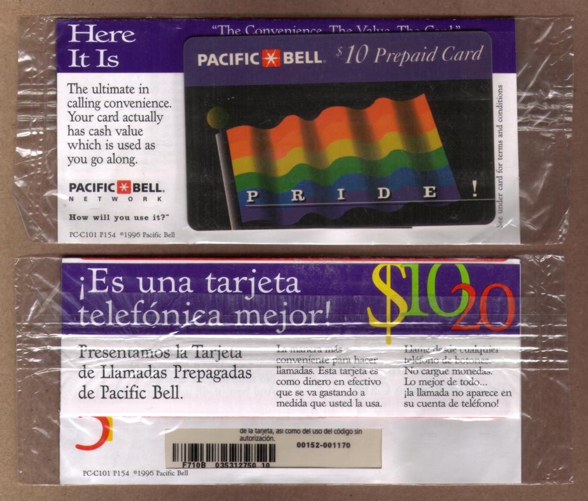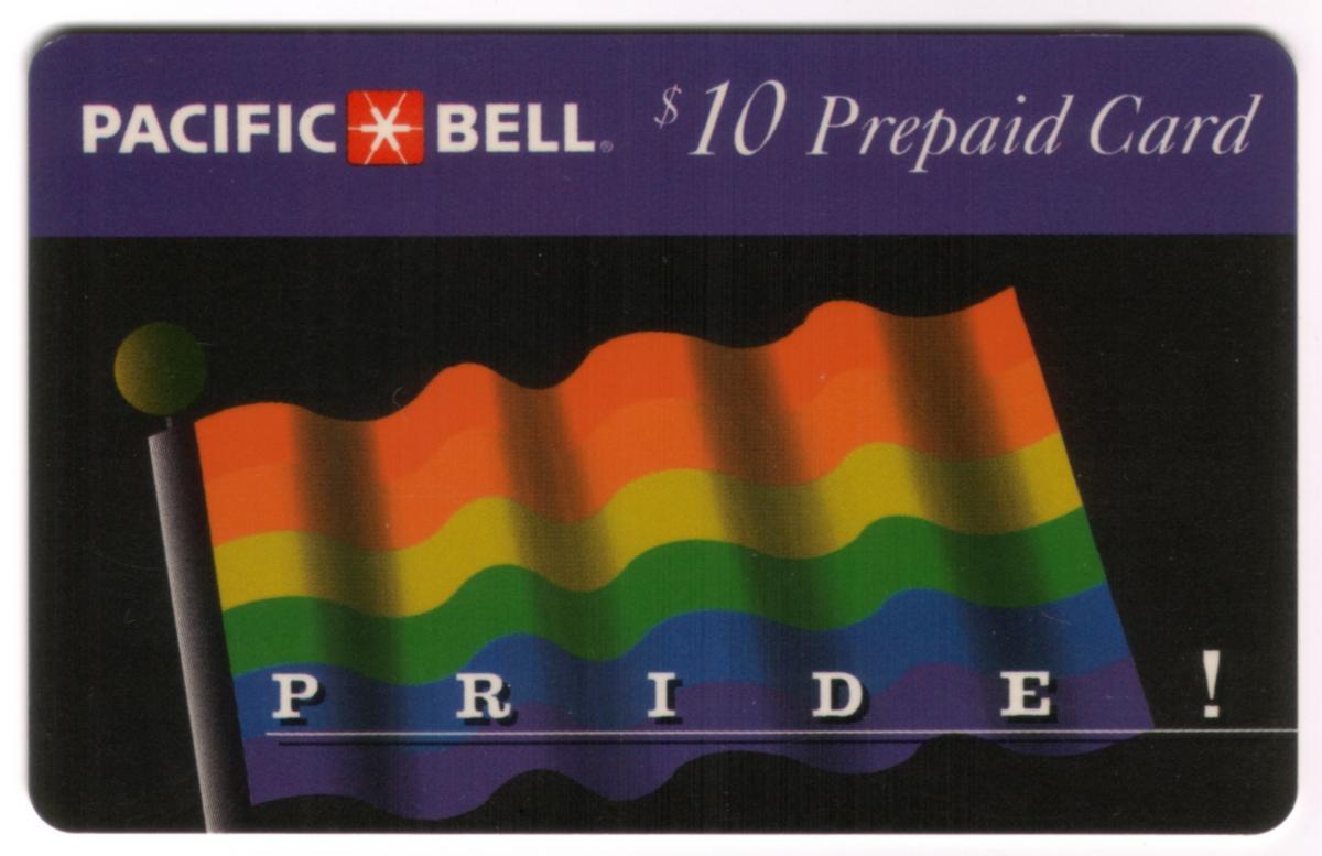 The Pacific Bell branding and the Rainbow Pride Flag make this prepaid card a unique collectible that celebrates lesbian and gay employee affiliates during the mid-1990s, linking telecommunications with social advocacy. The card is sealed and maintains a clean, bold visual style that directly celebrates pride and inclusivity without additional graphics or clutter.