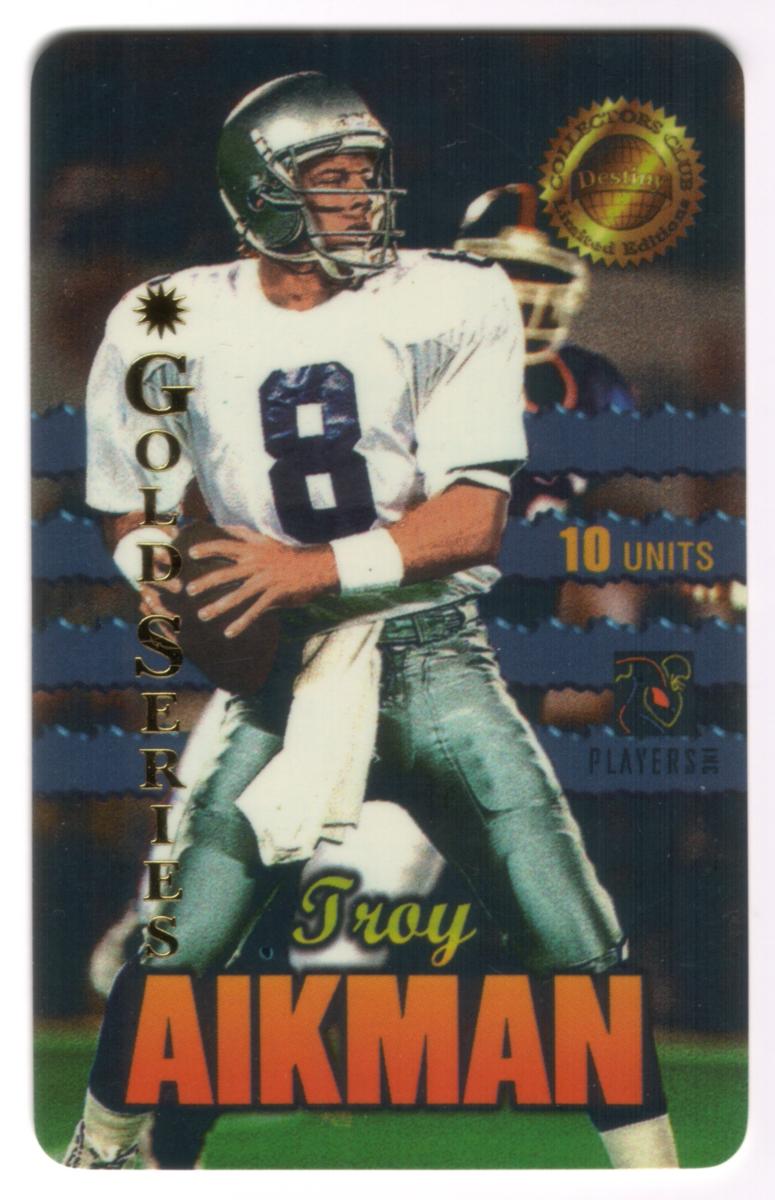 This collectible phone card features Troy Aikman in a football action pose, ready to throw a football. He is wearing a white football jersey with the number 8 and silver football pants. Troy Aikman was a quarterback for the Dallas Cowboys in the NFL. The card includes the text "GOLD SERIES" vertically on the left side and "Troy AIKMAN" in large bold letters at the bottom, with "Troy" in cursive above "AIKMAN."