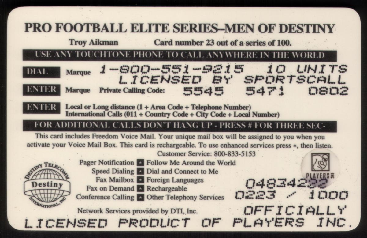 This card is part of the 10u GOLD Men of Destiny series and is numbered as card #23 out of 100. The design and information confirm its association with NFL football and specifically with the player Troy Aikman from the Dallas Cowboys.