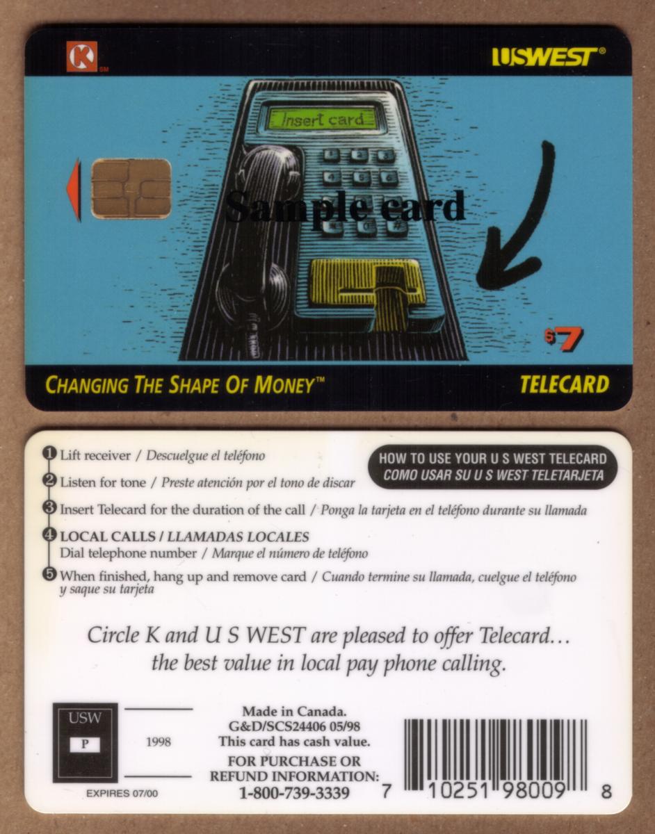 The design includes printed images of telephones, emphasizing the theme of phones on phonecards and payphones. The presence of the G&D chip logo indicates the card’s technology for stored memory and service (SVC) functionality. The card was released as a promotional item through Circle K, marking it as a special edition rather than a standard issue.