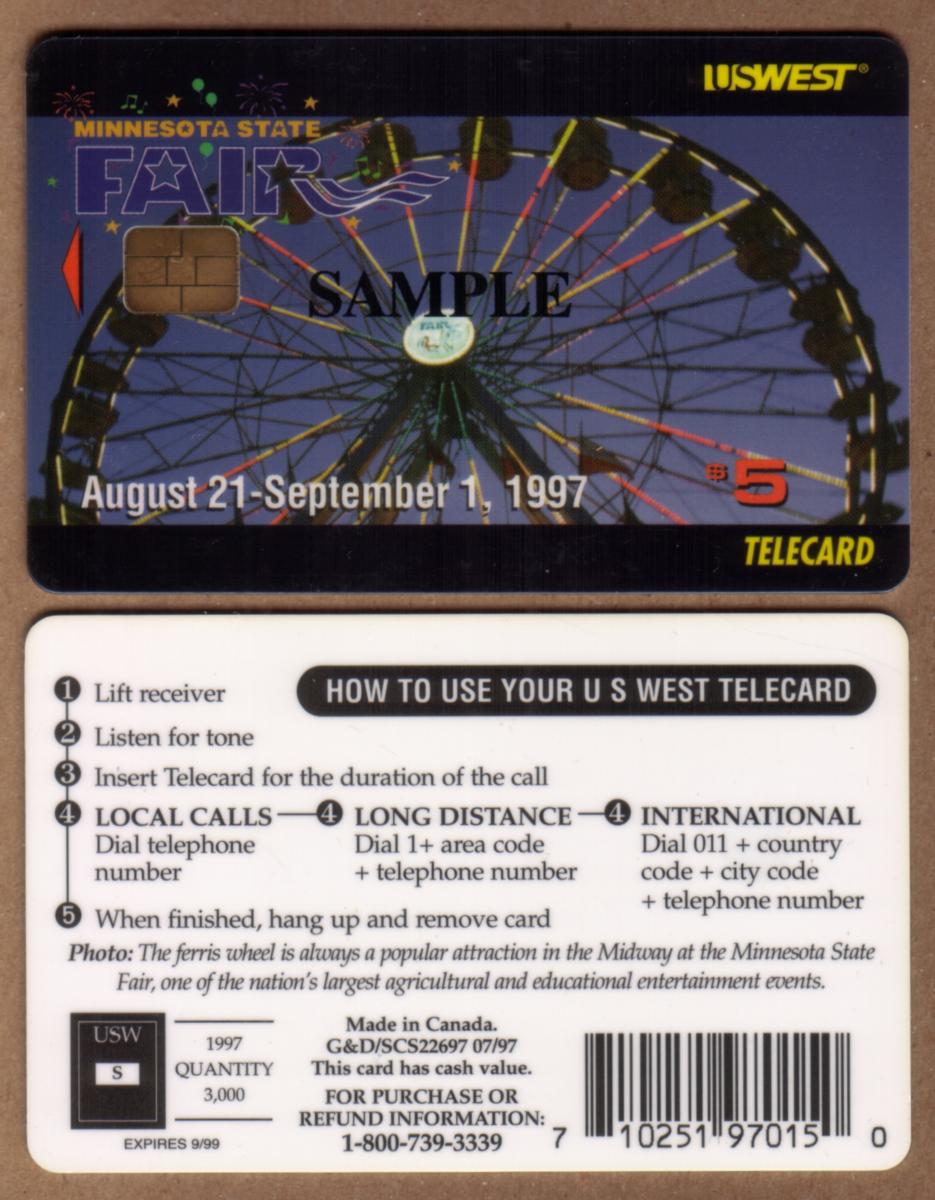 The card displays text indicating its $5 stored value, with clear references to the Minnesota State Fair 1997. The branding of U.S. West Communications is prominent, identifying the issuing telecommunications company. The chip is embedded on the front surface of the card, representing its functionality as a smart card used for service or payment.