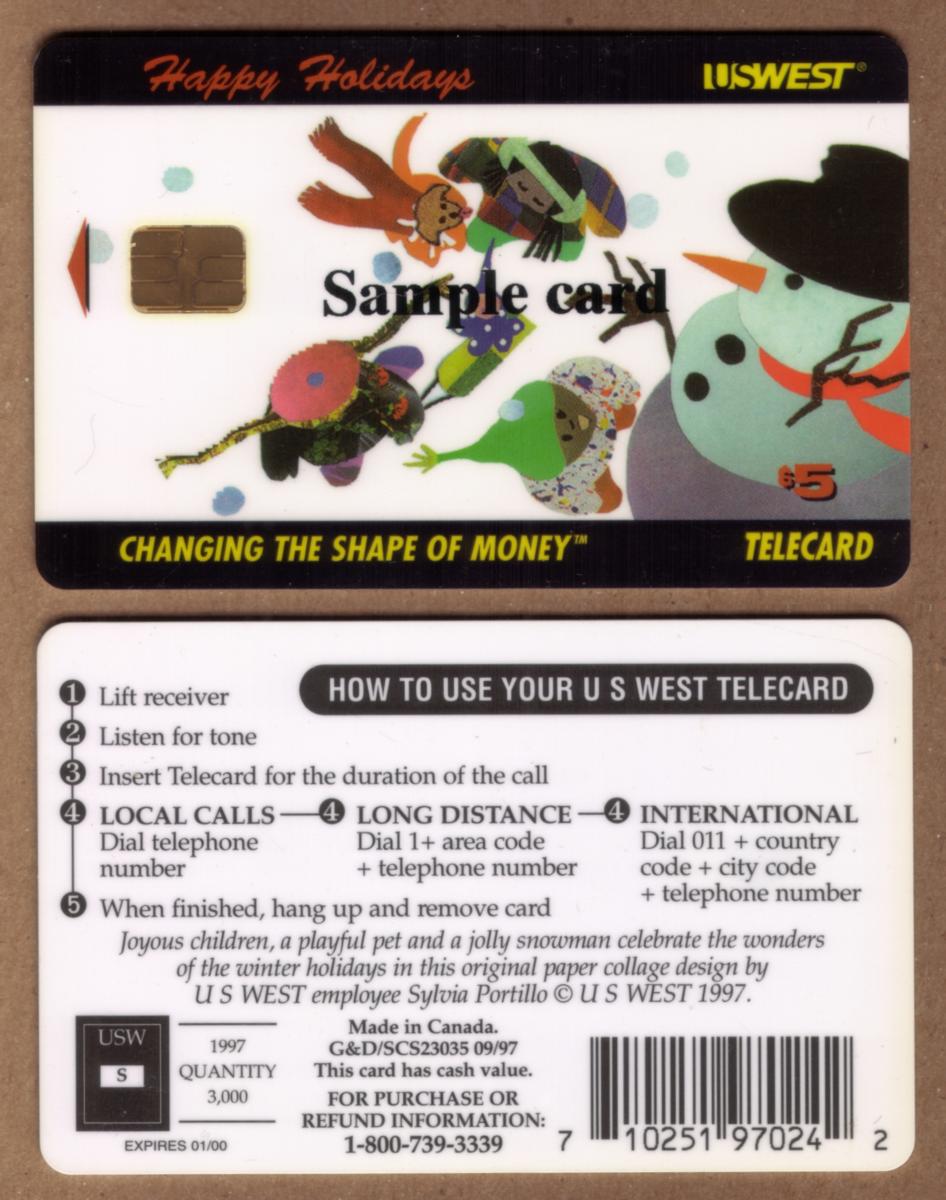 U.S. West Communications branding is visible, confirming the card's origin and purpose within telecommunication services at that time. The use of a smart chip establishes it as a stored value card, intended for use within the U.S. West phone network. Overall, the card brings together holiday imagery, children, animals, and the recognizable U.S. West identity in a visually appealing composition.