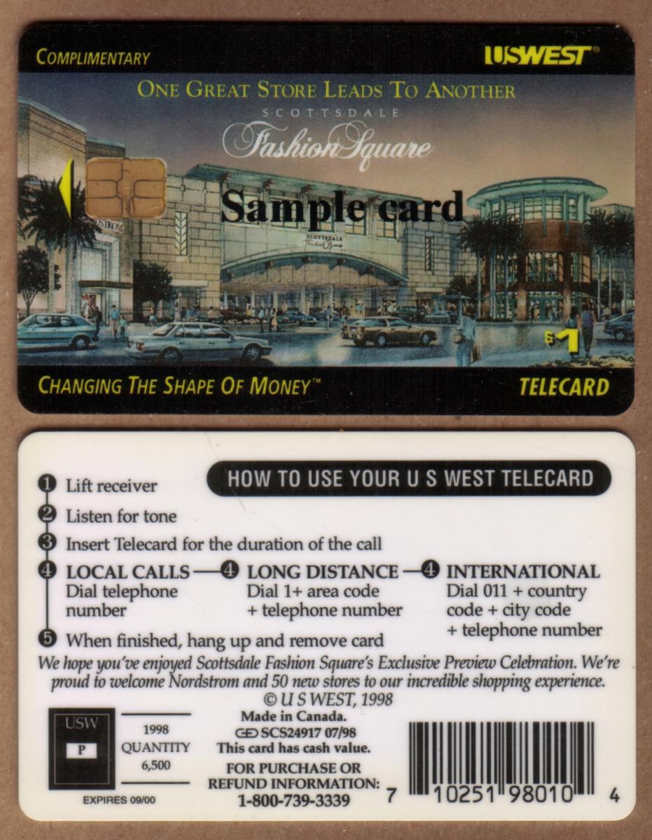 This collectible chip card is a U.S. West communications promotional stored value card issued in 1998. It features a $1 value and was designed for use at Scottsdale, Arizona’s Fashion Square Mall. The card showcases the tagline “One Great Store Leads to Another” along with the U.S. West logo prominently displayed. The design includes references to shopping malls, automobiles, and transportation, underscoring U.S. West’s connection with multiple sectors and services.