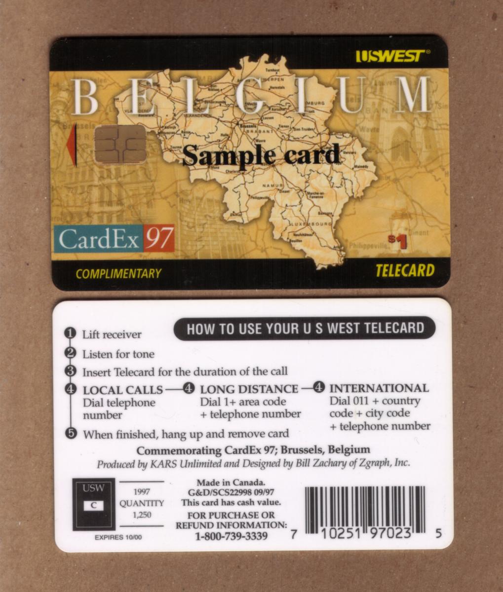 Belgium map card from 1997 CardEx exhibition, featuring vivid colors, U.S. West logo, and a $1. Comp. denomination, highlighting vintage collectible design. |